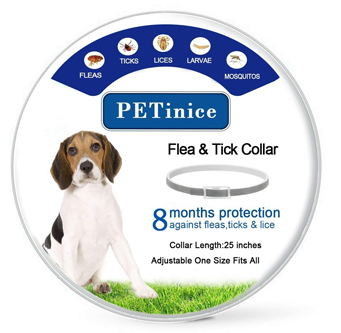 This flea, tick, lice, mosquito, and larvae flea collar is waterproof, and comes in an adjustable size. There is an 8-month protection against fleas, ticks and lice. One-size collar fits all dog sizes. The adjustable collar length is 25 inches.