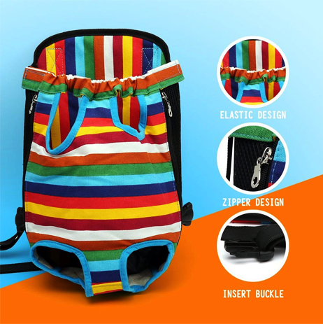 This backpack is made from a high-quality multi stripe canvas. Unique in style, with legs and tail outside, velcro with zippers, and breathable mesh for pooch ventilation, this backpack works well. It has adjustable shoulder straps, and is hands-free!
