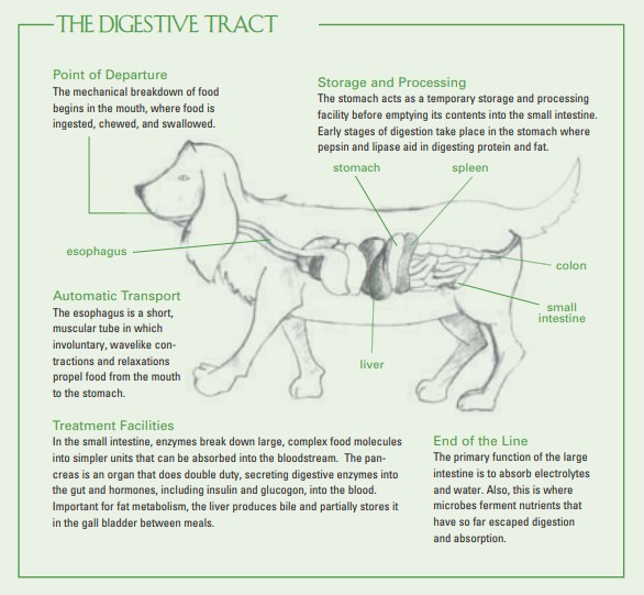 The above illustration should holistically answer this question for you. Here’s what happens inside you large dog from when they start eating to the end of the line: