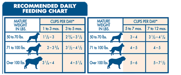 - Puppies require more calories, below is a useful visual feeding chart on how much to feed large breed puppies: