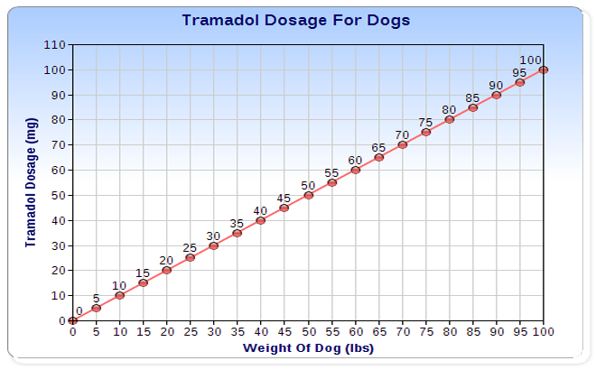 . . . it is recommended that dogs be given Tramadol at 0.45 to 1.8 mg per pound of the dog’s body weight. The recommended frequency is every 8-12 hours.